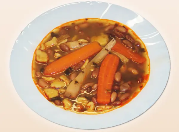 ● Marhahúsból készült, gazdagon fűszerezett leves, zöldségekkel, csipetkével